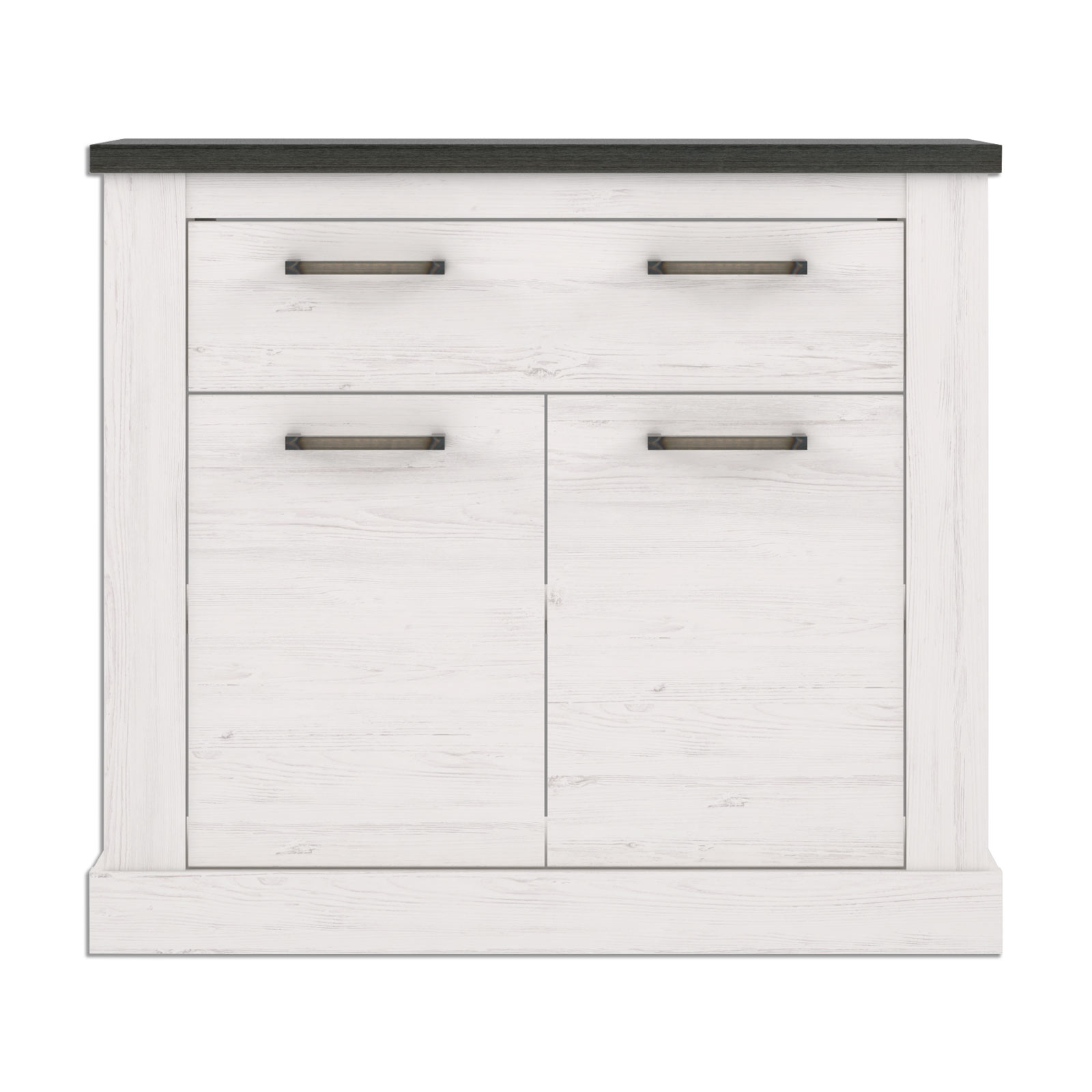 In dieser etwa 102 Zentimeter breiten Kommode finden Sie eine Menge Stauraummöglichkeiten für die verschiedensten Utensilien. Hinter den beiden Türen können Sie beispielsweise Ihr Schuhe verstauen und im zweigriffigen Schubkasten finden kleinere Gebrauchsgegenstände reichlich Platz. Der Farbmix aus Pinie weiß und Touchwood Nachbildung wird in Ihrem Eingangsbereich für ein modernes Ambiente sorgen.