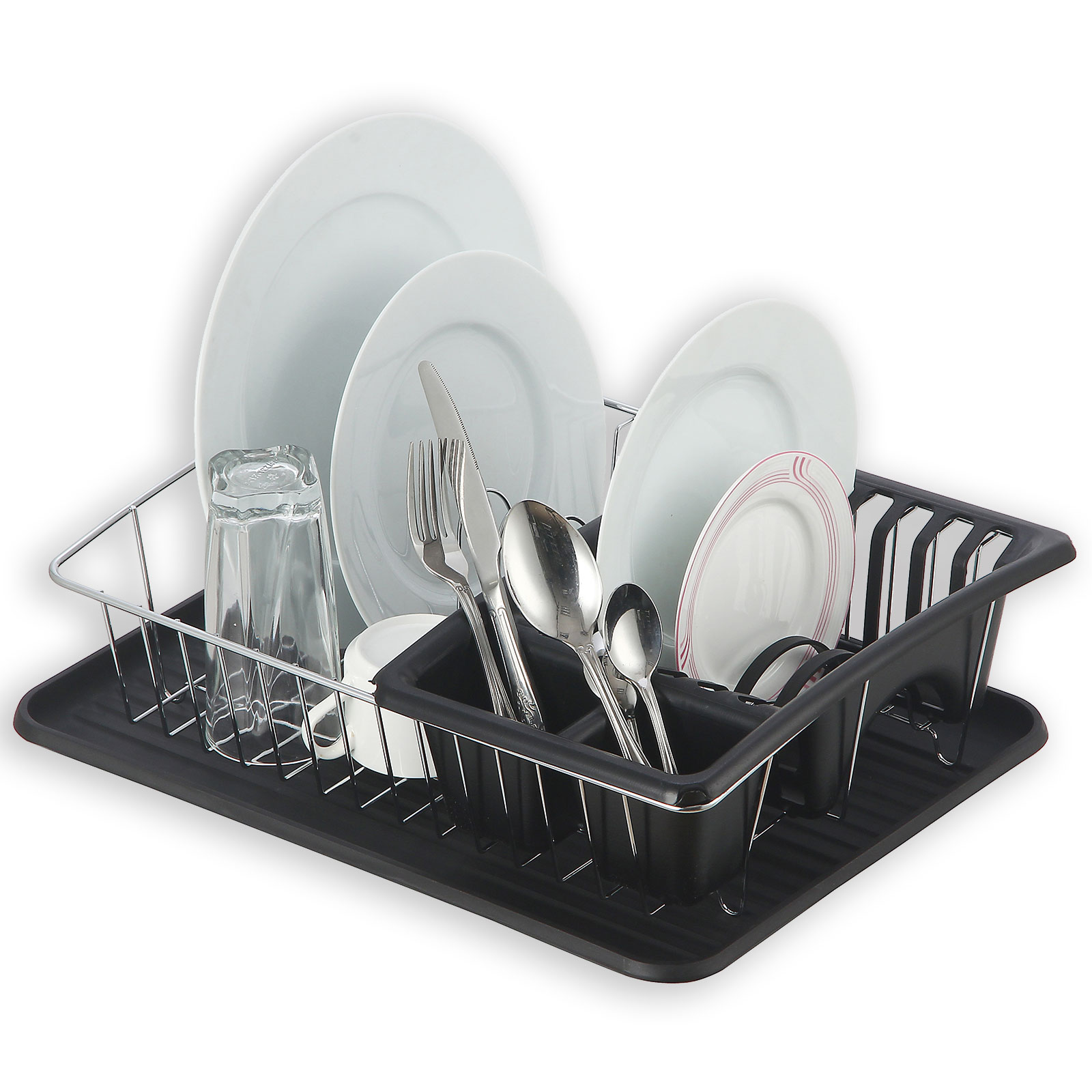 Dieses funktionelle schwarze Abtropfgestell besteht aus 2 Teilen: Einem sinnvoll aufgeteilten Geschirrkorb, der Ihnen viel Platz für Geschirr und Besteck bietet und einem Tablett.