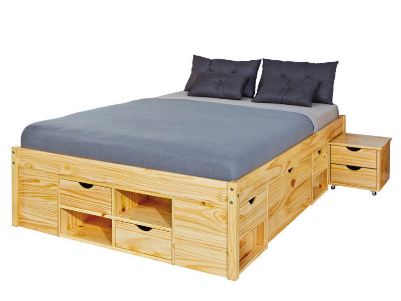 Das Funktionsbett verwandelt den sonst ungenutzten Platz unter dem Bett in nützlichen Stauraum. Die großen Schubkästen bieten Platz für Bettwäsche und die sonstigen Fächer und Schubladen bieten ebenfalls reichlich Stauraum der nach Belieben genutzt werden darf. Zusätzlich ist das Funktionsbett mit rollbaren Nachtkommoden ausgestattet auf denen z.B. eine Lampe abgestellt werden kann. Das Funktionsbett besteht aus robustem Massivholz. Das verarbeitete Material stammt aus einer umweltfreundlichen Produktion und wurde sorgfältig ausgewählt. Die Oberfläche wurde mit einem transparenten Lack behandelt, was die natürlichen Holzmaserungen besonders schön unterstreicht.