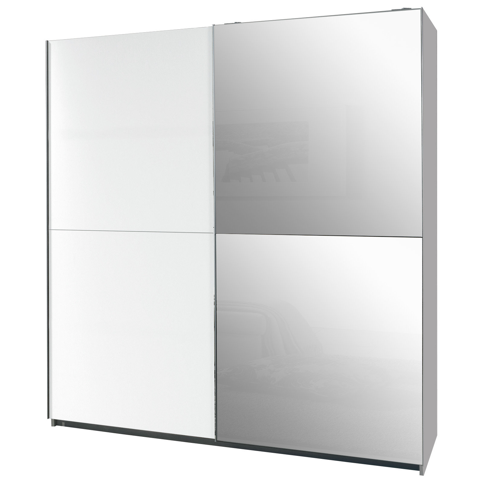 Dieser edle Schwebetürenschrank verfügt über eine Spiegeltür und eine Tür in Alpinweiß. Der Innenraum des Schrankes ist in zwei gleich große Hälften aufgeteilt, die jeweils mit einem Wäscheboden und einer Kleiderstange ausgestattet sind. So bietet Ihnen dieser fabelhafte Schwebetürenschrank viel Stauraum für Ihre Garderobe.