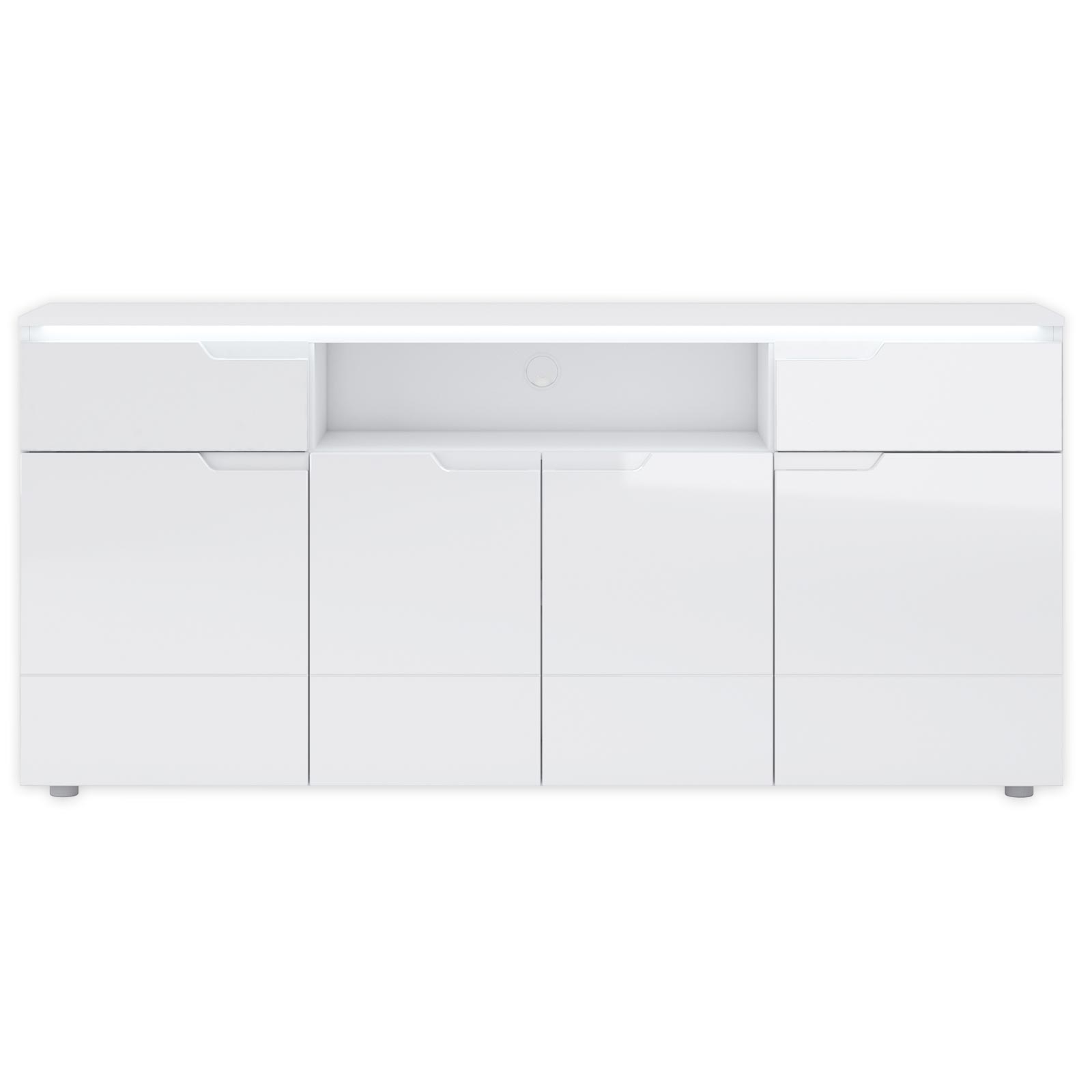 Das etwa 180 Zentimeter breite TV-Sideboard wird in Ihrem Wohnraum ein modernes Ambiente versprühen! Die weiße Farbgebung lässt sich mit den unterschiedlichsten Einrichtungsstilen kombinieren und die grifflose und hochglänzende Front ist der Hingucker! Hier können Sie nicht nur Ihr Fernsehgerät platzieren, zudem bietet das Sideboard auch reichlich Platz für die verschiedensten Gebrauchsgegenstände. Diesen Stauraum finden Sie hinter vier Türen und in zwei geräumigen Schubkästen. Das absolute Highlight ist die Lichtleiste, die an der Front befestigt wird.