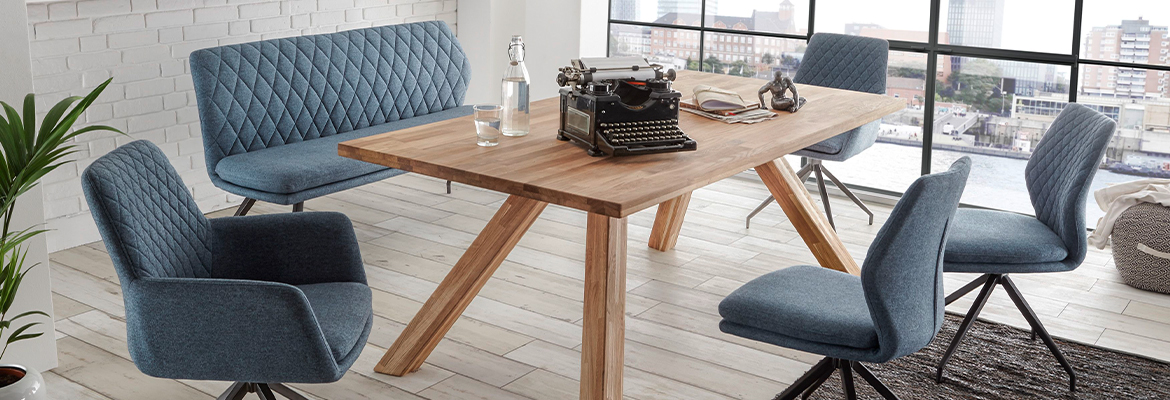 Der Massivholztisch bietet sich hier geradezu an, denn er ist häufig der Mittelpunkt des Esszimmers und fällt beim Eintreten in den Raum meist direkt ins Auge. Steht sein Stil im Kontrast zur übrigen Einrichtung, ist er garantiert ein Hingucker, der dem ganzen Raum einen besonderen Reiz verleiht.