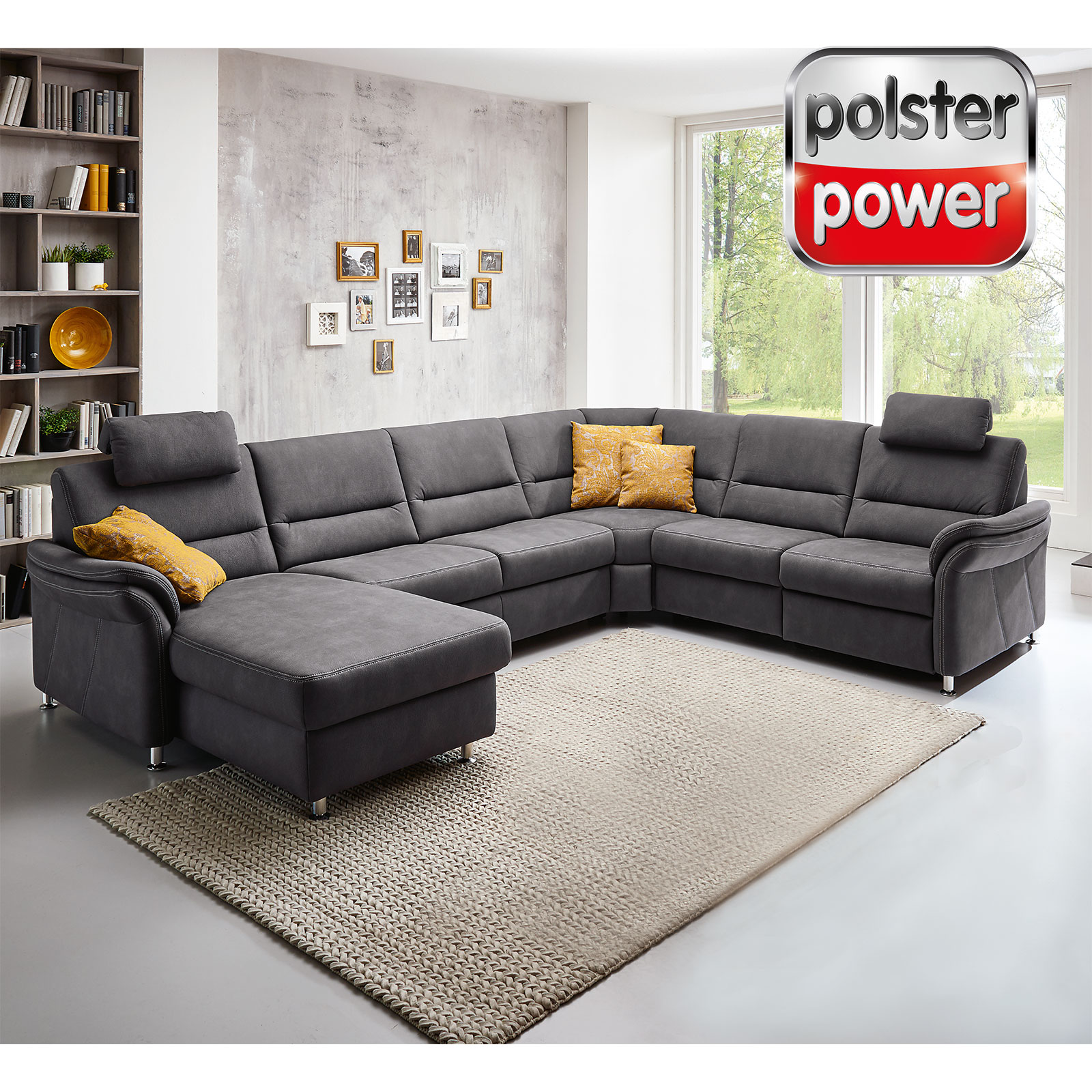 Eine Wohnlandschaft bei der Entspannung und Komfort ganz groß geschrieben sind. Der Mammut graue Microfaserbezug ist angenehm auf der Haut und der Farbton lässt sich super kombinieren. Auf dem Gestell aus Hartholz und weiteren Holzwerkstoffen ist ein Aufbau einer Wellenunterfederung mit Kaltschaum gepolstert. Eine Liegefunktion ist ebenso wie eine Relaxfunktion vorhanden. Auf der rechten Seite befindet sich eine aufklappbare Funktionsablage mit integrierter Steckdose und USB-Anschluss. Die Wohnlandschaft hat Stellmaße von ca. 330 x 89 x 262 cm.